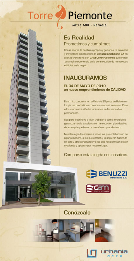 A pocos días de haber finalizado y entregado a sus nuevos propietarios el emprendimiento más importante denominado "Torre Piemonte" en la ciudad de Rafaela, CAM tiene el agrado de dar a conocer a todos sus clientes que ya está trabajando en el segundo edificio de la vecina ciudad.
