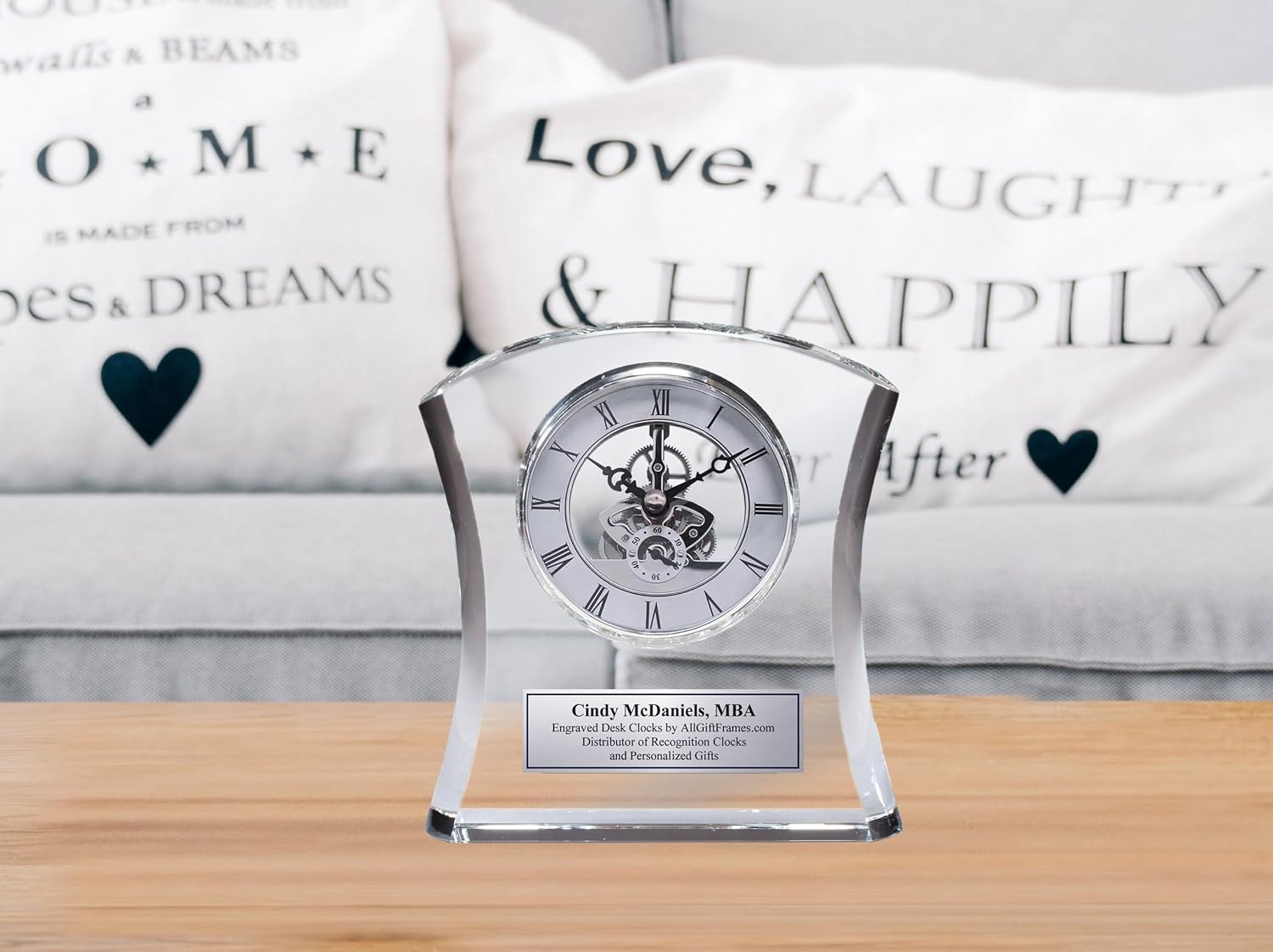 Tower Da Vinci Crystal Clock with Silver Dial and Silver Engraving Plate. Personalized Desk Clock As Wedding Gift, Retirement, Employee Service Awards and Executive Gifts If you have any questions, email us through AchievementGifts (Amazon) or AllGiftFrames. Sleek Curve Crystal Desk Table Shelf Clock with Da Vinci Dial and Silver Engraving Plate You can find that perfect recognition employee logo clock gift. Personalized corporate logo recognition and employee retirement desk clock and service award clock provide the recognized employee with everything they need to motivate and succeed in the workplace. Every personalized award desk clock product we manufacture and sell are filled with distinction and imagination. After you place your order, email us through AchievementGifts (Amazon) or AllGiftFrames and let us know your Personalization information. Complimentary Engraving 1-4 lines on Silver engraving plate. Complimentary Inspirational Quotes Keychain Gift. Browse through our engrave table desk clock and you will find a vast selection of wedding anniversary clocks, retirement gifts and employee recognition awardsPromotional desk clocks. Each anniversary clock gift and wedding personalized desk clocks can be engraved Complimentary of charge. This cherry clock suspended in glass case with da vinci gear dial clock. Our website specialized in personalized engraved etched wooden desk table clocks as wedding anniversary gifts and corporate retirement gifts. We also carry unique corporate trophy products. For sale anniversary clocks personalized with a message or corporate logo. Decorate your home or office with one of our wedding anniversary keepsake table desk clocks. We have hundreds of different clock designs to match your gift giving taste.