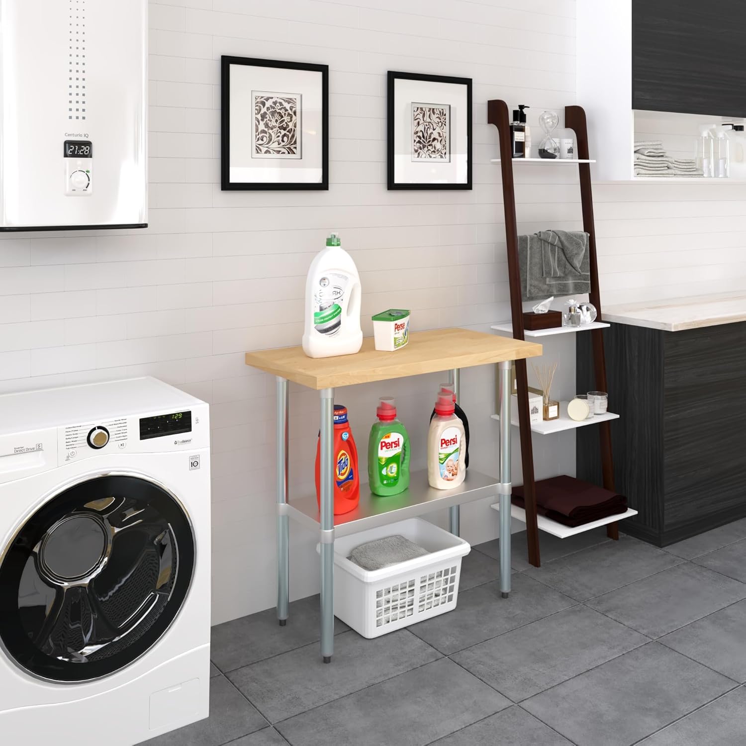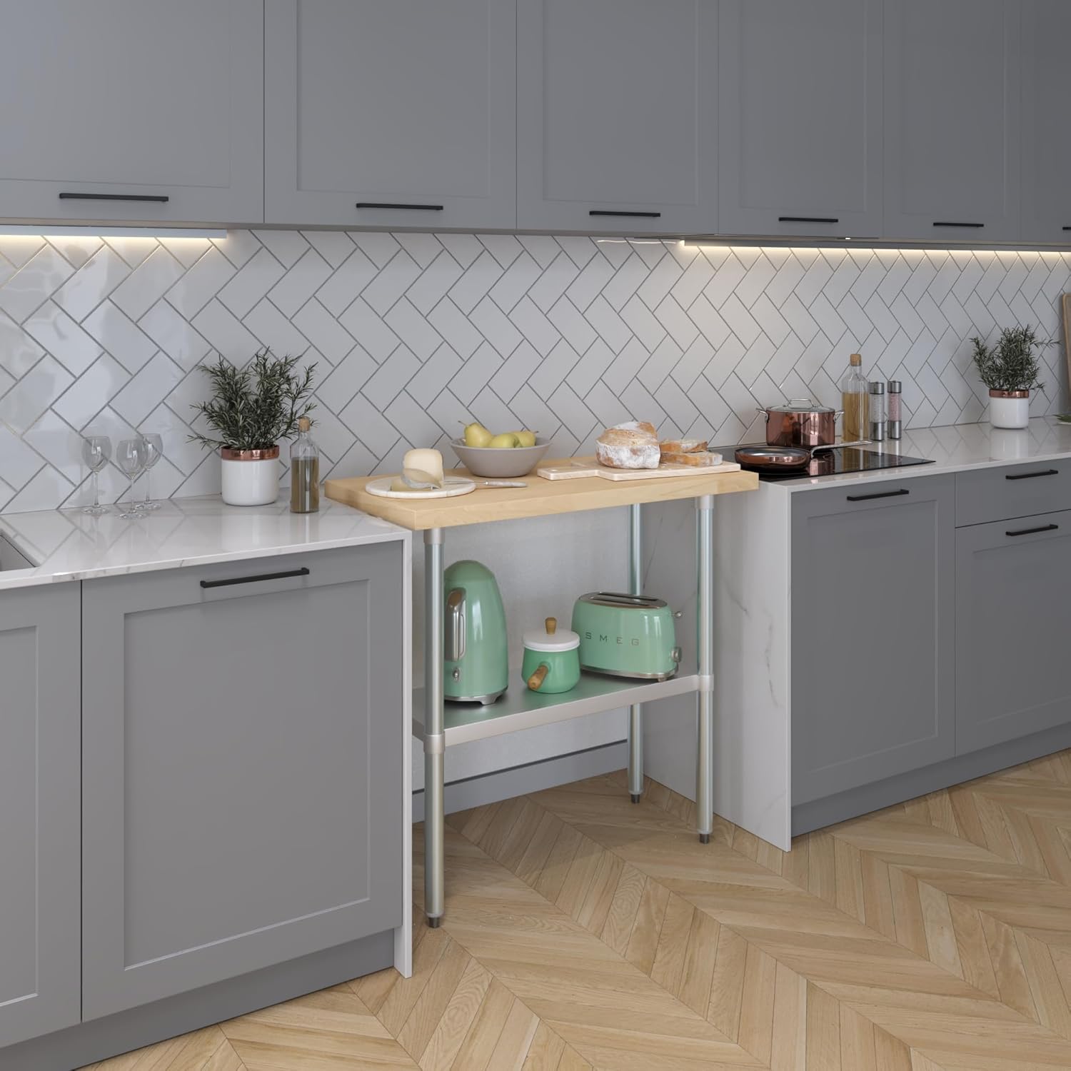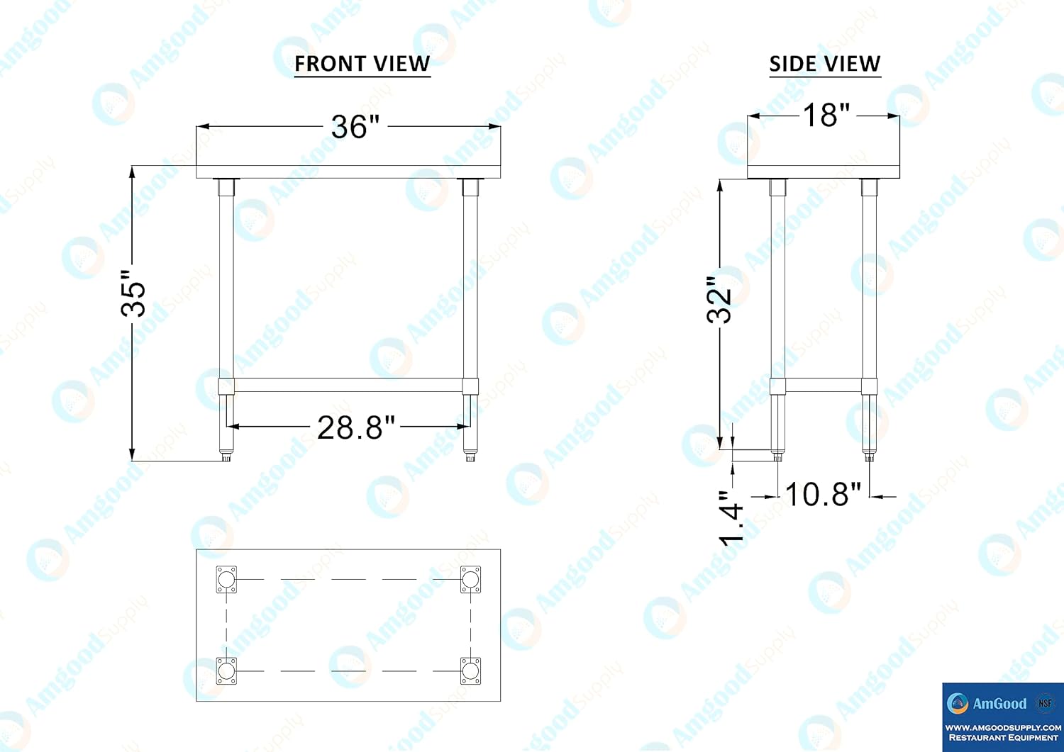 Transform your restaurant, home kitchen, garage or any space with the exceptional AmGood 18" x 48" Wood Top Work Table. This versatile table, featuring a galvanized base and adjustable undershelf, is not only perfect for a variety of food service tasks in restaurants but also finds its place in home kitchens and other applications. Crafted with a durable galvanized steel base and a sturdy 1 1/2" thick top made from North American hard rock maple wood, this work table guarantees longevity and reliability, making it suitable for diverse environments. The maple wood surface, renowned for its durability, serves as an excellent food preparation area while preserving the sharpness of your knives. Experience convenience with the adjustable undershelf, allowing you to store supplies, small appliances, and tools within arm's reach. The table's adjustable 1" bullet feet ensure precise leveling, accommodating uneven surfaces with ease. Whether you need to chop vegetables, roll handmade pasta, work with dough, or tackle various other tasks in your kitchen, workbench, or any other setting, this versatile work table is designed to meet your needs. Please note. the table ships knocked down. Assemble and install with no effort. No additional tool or kit is needed. Everything you need is included. A Maple Wood Top Work Table is a great addition to any home or business. It is perfect for a variety of tasks, including a workbench, prep table, or general-purpose table. The included bottom shelf provides additional storage space. Some assembly is required. Common Applications: Food Prep Table For Commercial Kitchen Kitchen Island Counter Extension Utility Bench for Shop Professional Work Station Garage Work Bench Laundry Clothes Folding Table Brewing Setup Butcher Shop