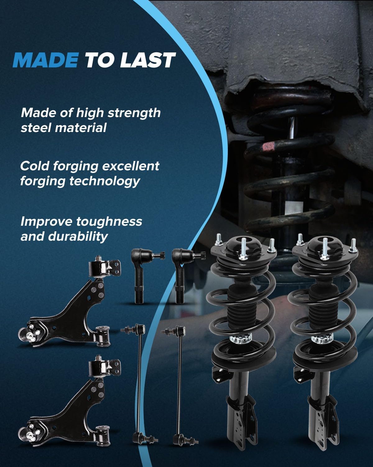 • PACKAGE CONTAINS: 2PCS Front Complete Struts Coil Spring Assembly+ 2PCS Control Arm and Ball Joint Assembly+ 2PCS Stabilizer Bar Link Kit+ 2PCS Tie Rod End, Front shock absorber kit for Buick Enclave for Chevrolet Traverse Front Struts and Control Arm