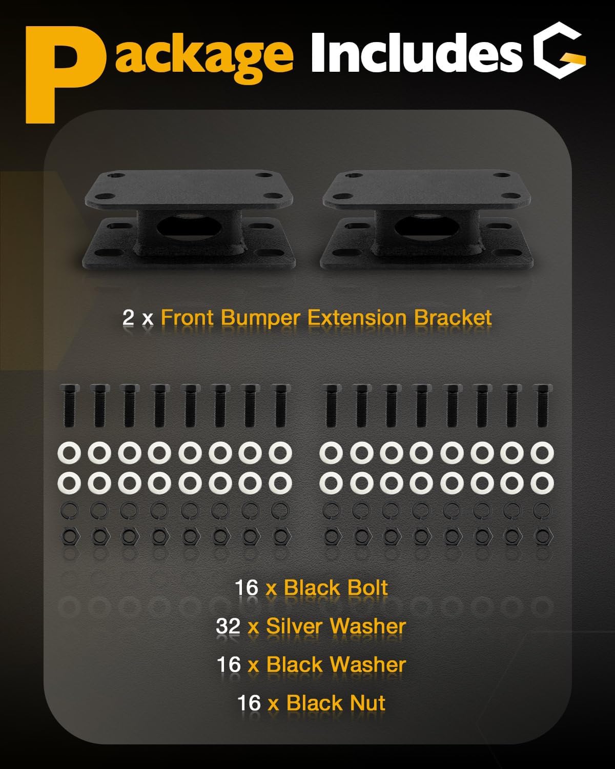 Packing List:2 x Front Bumper Extension Bracket2 x Mounting Hardware (16 x Black Bolt, 32 x Silver Washer, 16 x Black Washer, 16 x Black Nut)Condition: NewCompatible with:2007-2018 Jeep Wrangler JK2018-2024 Jeep Wrangler JL2021-2024 Jeep Wrangler 4Xe2020-2024 Jeep GladiatorFunction: Are you still troubled by the need to drill holes when installing a bumper? Frustrated by the lack of space between the front of the car and the bumper? Then our front bumper extension bracket is your perfect solution.This bracket eliminates the hassle of drilling by leveraging factory-preinstalled mounting points, ensuring a damage-free installation. Its precision-engineered design creates optimal clearance between the vehicle's front end and the bumper, addressing fitment issues while enhancing overall aesthetics and functionality. Say goodbye to installation frustrations and enjoy a seamless, stress-free upgrade for your vehicle.