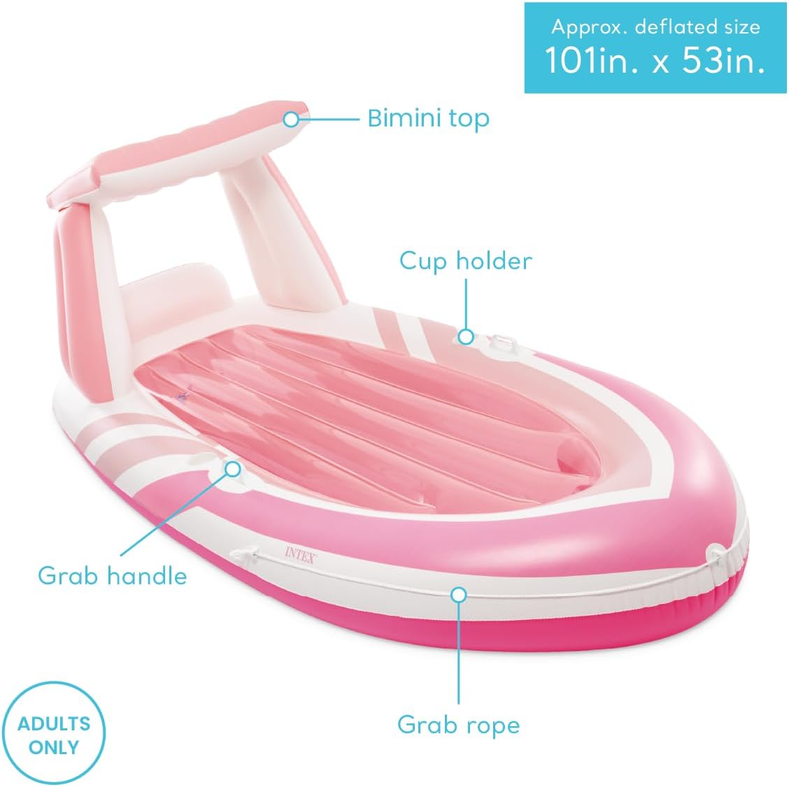 Add a splash of pink to your pool party with this boat-like float. A built-in bimini top provides shade from the sun.