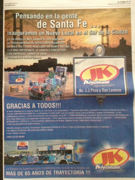El domingo 2 de Septiembre el Sr Jorge Kilgelmann publico una pagina en el diario El Litoral con motivimo de la apertura de una nueva sucursal de su cadena de supermercados denominada JK Kilgelman ubicada en las calles Av. J.J. Paso y San lorenzo a continuacion transcribimos el texto.