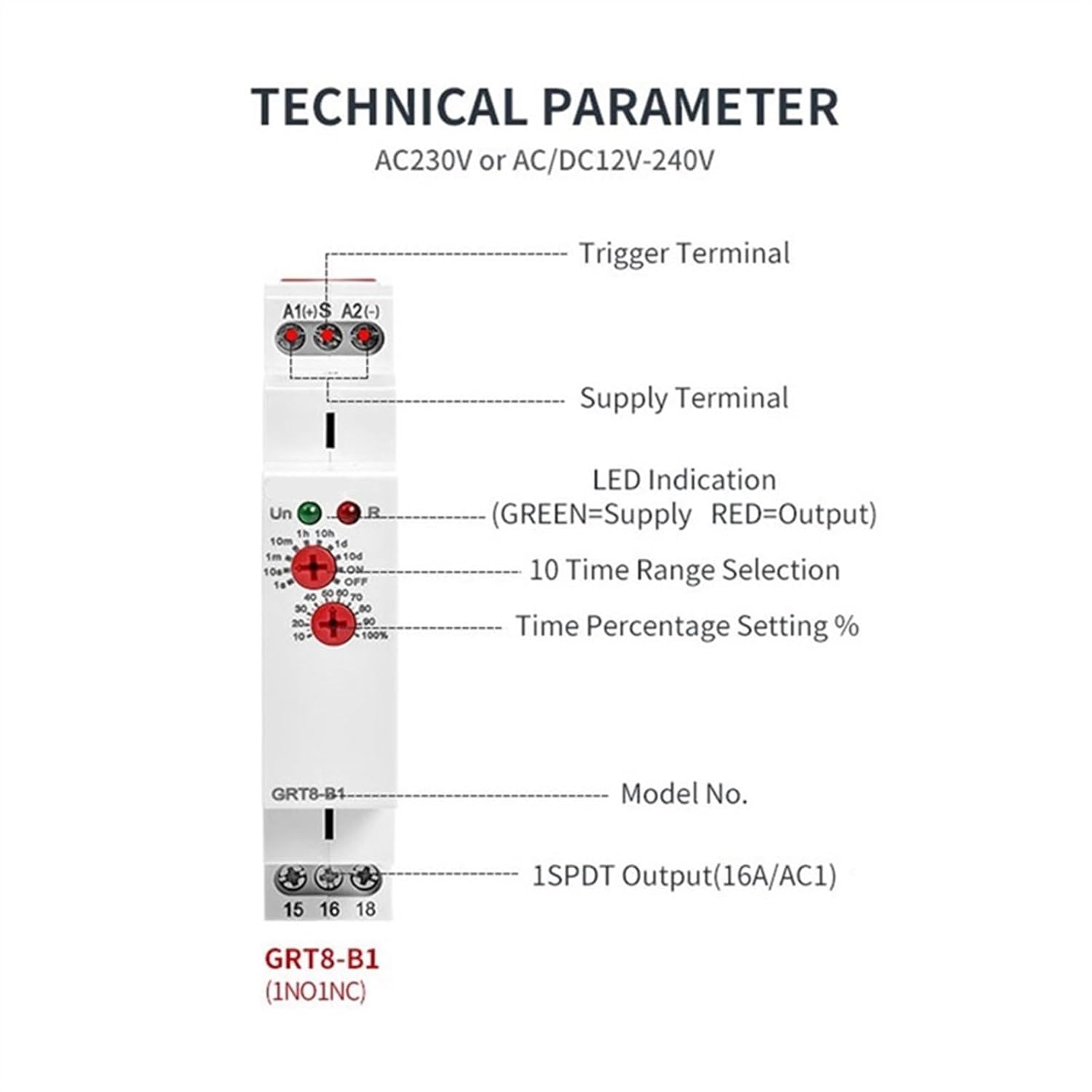 Circuit BreakersApplications: Suitable for applications where function and time requirements are knownTime switch, possible to be used for pump decay time after switching heating off, switching of fansFunction Features: GRT8-B Delay off FunctionSupport Wide Range Voltage: AC230VOutput Contact: 1SPDT(1NO1NC) or 2SPDT(2NO2NC)Time scale 0.1 s - 10 days divided into 10 ranges, time setting by a potentiometer.0.1-1s, 1-10s, 6-60s, 1-10min, 6-60min, 1-10hr, 0.1-1day, 1-10day, only ON, only OFFRelay status is indicated by LED.1 MODULE 18mm, DIN rail mounting.size: 90 x 18 x 64mmMaterial: PCcolour: whitePackage Contents: 1 x Time RelayOnly the above package content, other products are not included.Note: Light reflection and different displays may cause the color of the item in the picture a little different from the real thing. The measurement allowed error is +/- 1-3cm.