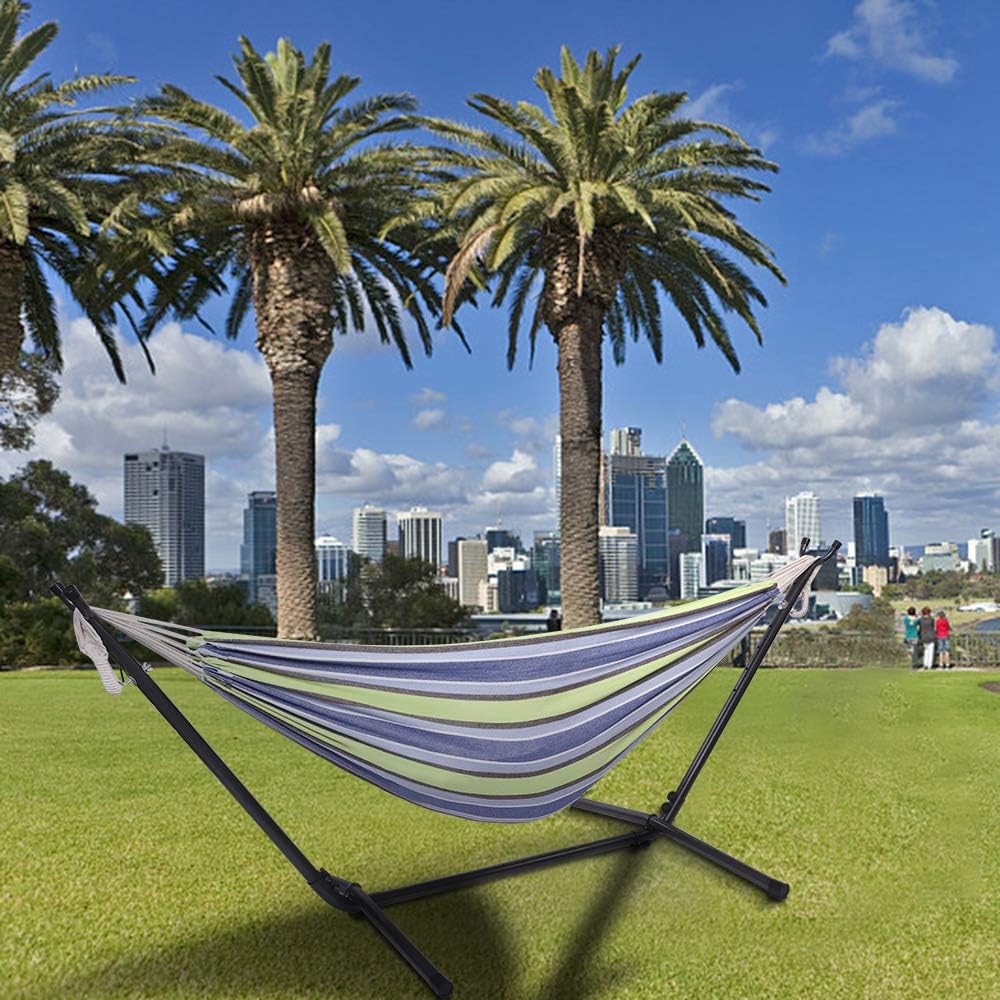 Warning:1. Please make sure to lock all the plastic nuts and S hooks before using.2. Never allow young children to use the hammock or stand unaccompanied by an adult.3. DO NOT EXCEED THE LOAD LIMITATION OF 250LBS. (This load limitation has been tested for when you swing back and forth gently on the hammock. If you sit still, the load limitation is about 250 LBS.)Introductions:Enjoy yourself in our Portable Outdoor Polyester Hammock Set at any time! It is composed of a hammock, a hammock stand and a portable handbag. Each item in this offer is made with premium material and delicate workmanship, with ensured quality and durability. Thus, you can carry it along easily for all kinds of outdoor activities. Also, the hammock could bear up to 135Kg weight to the maximum so that even two persons are allowed to lie on it freely without any worry and concern. What are you waiting for? The intoxicating leisure time is waving its hands to you!Specifications:1. Material: Polyester2. Dimensions: (102.3 x 41.33 x 39.37)" / (260 x 105 x 100)cm (L x W x H)3. Weight: 30.64 lbs / 13.9 kg4. Color: Green5. Weight Capacity: 250lb / 135kgPackage Includes:1 x Hammock1 x Hammock Stand1 x Handbag