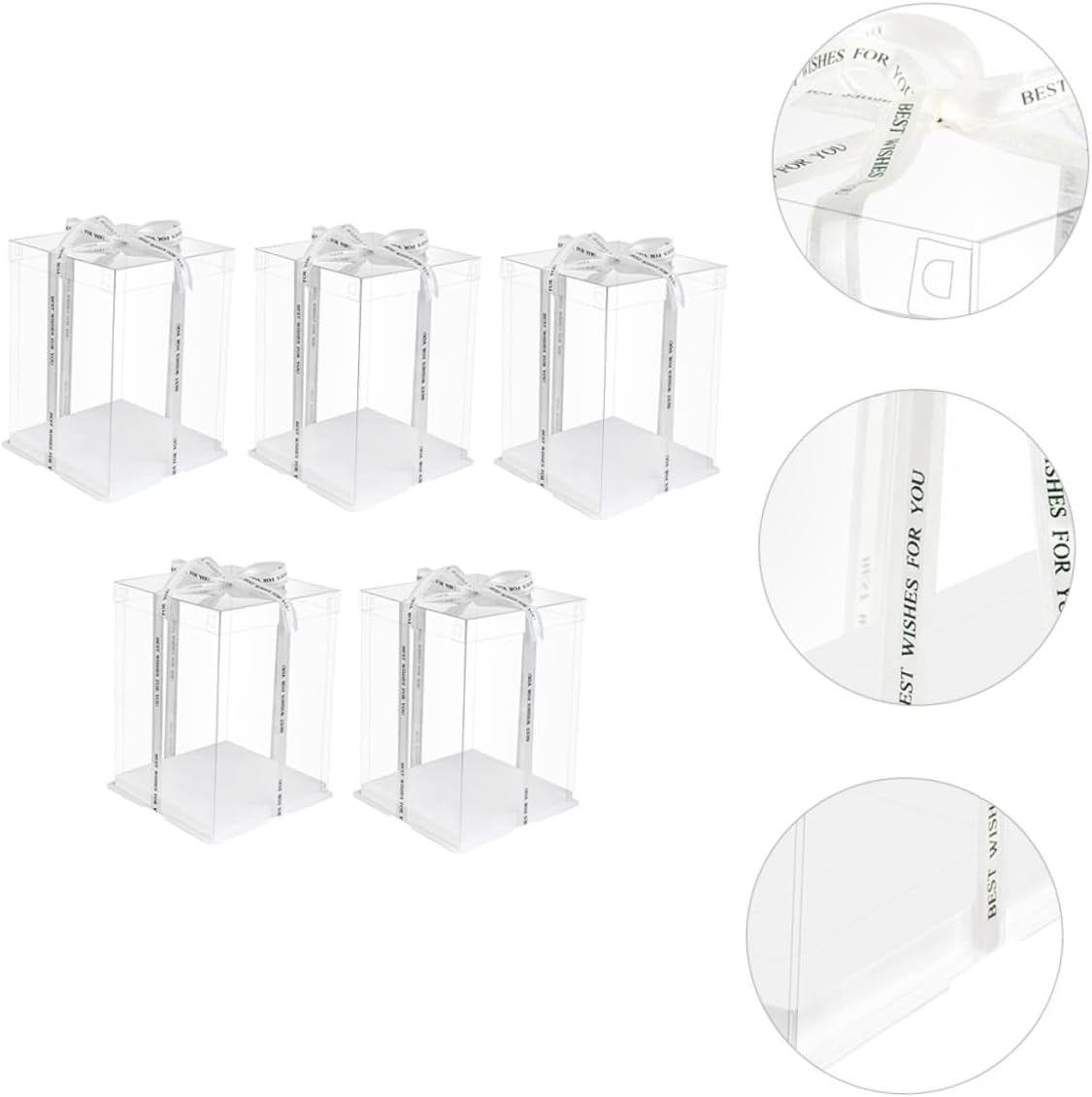 Package List 5 x cake packaging boxes Characteristics - Material: Food grade white card, PET. -Product Info:Birthday Cake Box - Color: White (Random color for ribbon). - Applicable: for 8 inch cake Cake Carrier. - Size: 26.00X26.00X25.00cm/10.22X10.22X9.82inch. - Ribbon design to keep the food sealed and prevent the cover coming off Transparent Cake Boxes. - Made of material, which is very and safe to use. - Very suitable for wrapping Christmas, New Year, birthday, holiday cakes Cake Packing Case. - With ribbon for you to carry your cake or other food everywhere Cake Storage Container. - No bad odor, easy to clean, not easy to break, for car travel, outdoor picnics, etc Cake Wrapping Case.Goods InformationCake Storage Container It can be used for refrigerator or kitchen cupboard.Cake Wrapping Case This item is a cake carrier, made of and sturdy food grade white card, PET material.Square Storage Container The ribbon design makes this storage organizer more portable and practical.Transparent Cake Boxes Transparent surface helps you see the inner clearly