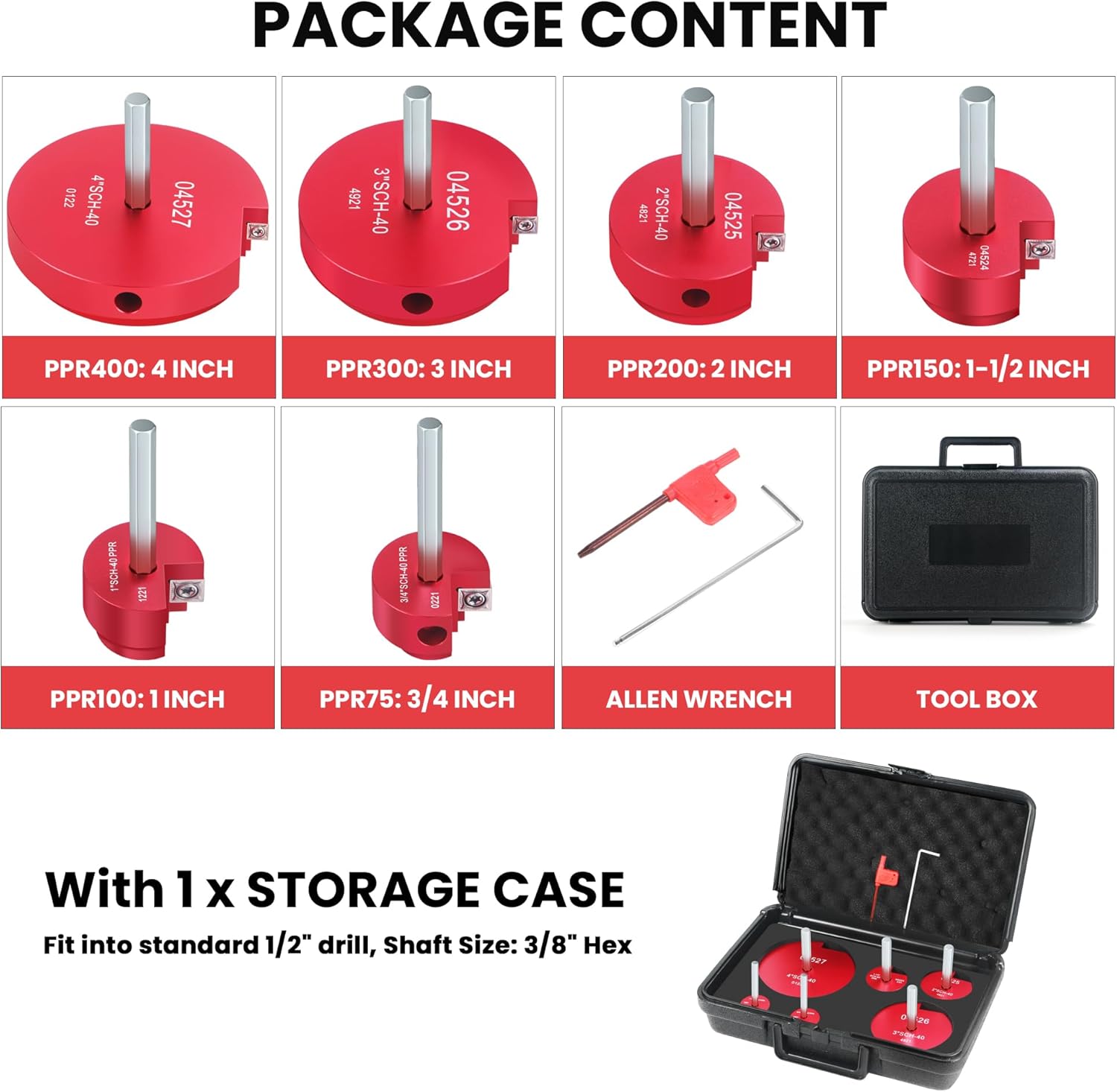 Introducing the PVC pipe reamer kit, a must-have tool for any household or temporary plumbing work. This PVC fitting saver set includes 6 reamers of different sizes (3/4 inch, 1 inch, 1-1/2 inch, 2 inch, 3 inch, 4 inch), catering to various pipe diameters. The pvc reamers feature a 3/8" hexagonal shaft, allowing compatibility with standard 1/2" drills, including cordless and impact drills. Equipped with hard carbide inserts, the pvc fitting saver offer exceptional performance with four cutting edges for longevity and efficiency. The heat-resistant inserts effortlessly drill through damaged pipes, ensuring a smooth and precise reaming process. Durability is a key feature of the PVC socket saver kit. Crafted from CNC-machined, anodized solid aluminum alloy, the pvc pipe reamer bodies are durable, while the stainless steel shaft enhances tool reliability. The coated surface resists damage, wear, corrosion, and rust, guaranteeing a long lifespan. Operating the pvc pipe reamers is simple. By securing the joint cutter onto the drill chuck and setting the drill to low speed, you can easily drill directly into the joint from the center position. Cooling the pipes with water as needed is important, especially when working at high temperatures, to prevent melting. The versatility of this pvc pipe reamer kit is remarkable.The PVC socket saver is designed to clean residual pipes and solvent cement residue on PVC, CPVC, or ABS fittings, suitable for exhaust pipes, drainage pipes, and water pipes, excluding Schedule 80 pipes.this multifunctional pvc fitting saver kit simplifies your pipe installation process. Please note that this pvc pipe reamer kit is tailored for North American pipe sizes, ensuring optimal reaming operations. Upgrade your plumbing toolkit with the pvc fitting saver kit for efficient, precise, and durable pipe reaming.