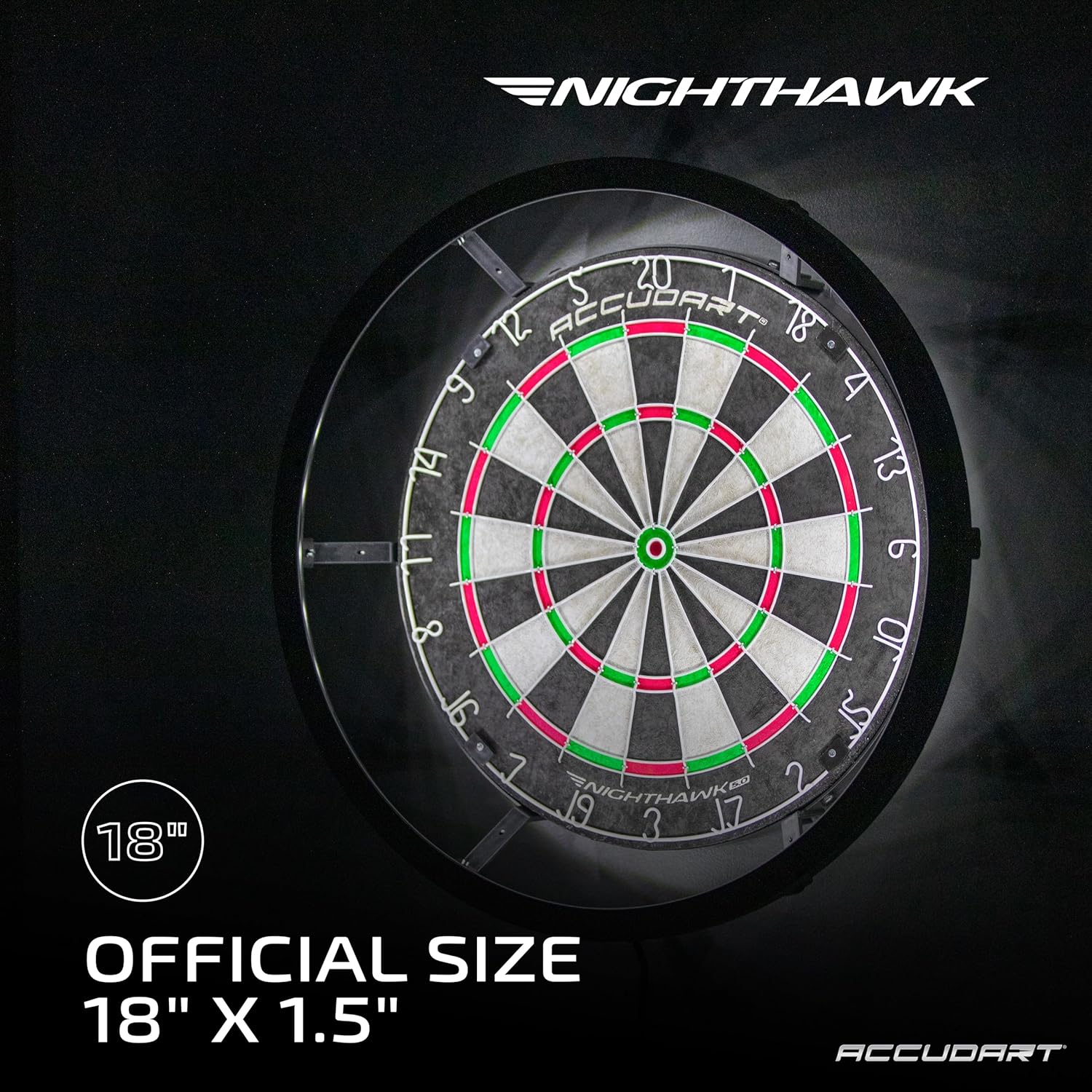 Transform your game room into a fully immersive darting arena with the Accudart Nighthawk 2‑in‑1 LED/Blacklight Bristle Dartboard Surround Set. Designed for both recreational and competitive steel‑tip players, this set features an official‑size 18" x 1.5" bristle dartboard made from premium self‑healing sisal to withstand years of consistent play. The standout feature of the Nighthawk is its innovative 360‑degree LED and blacklight surround lighting system. Switch effortlessly between vibrant LED illumination for tournament‑style visibility or blacklight mode for a dramatic glow‑in‑the‑dark effect that elevates nighttime matches. With an integrated dimmer switch, you can fine‑tune brightness levels to create the perfect ambiance for any play style. The durable bristle surface closes after each dart is removed, ensuring long‑term board integrity and reliable performance. To complete the setup, the Nighthawk includes two sets of 18‑gram glow‑in‑the‑dark steel‑tip darts, adding an exciting visual element to every throw. Whether you’re hosting competitive matches, leveling up your skills, or setting the mood for a unique glow‑in‑the‑dark game night, the Accudart Nighthawk delivers elevated gameplay and eye‑catching style in one premium dartboard system.