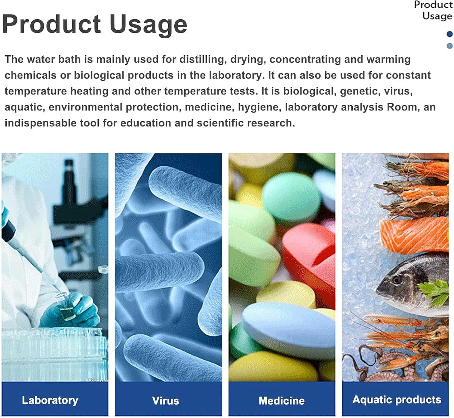 characteristic:The inner tank and upper cover are made of stainless steel plate, with high control accuracy and stable performance, and can be used for constant temperature experiments.This digital water bath can maintain the water temperature below 99.9 ° C at room temperature.Widely used for evaporation, drying, concentration, and constant temperature heating in enterprises, medical institutions, universities, scientific research departments, and production unitsSpecifications:Voltage: 110-220VPower: 300/600/800/1500 wattsCapacity: 3.4/6.7/13.5/22 litersTemperature range: ambient temperature+10 ° C to 100 ° CTemperature rise: 0.1 ° CTemperature fluctuation: ≤ ± 0.5 ℃Timing function: 0-999 minutesHeating element: 304 stainless steel heating tubeTemperature measuring element: PT100 sensorCoating material: 304 stainless steelShell material: sprayed cold-rolled sheetControl system: digital display, intelligent PID control, temperature adjustment, alarm, time range 1-999 minutes, temperature calibrationThis package includes:1 digital water bathPlease feel free to contact us for any questions. We will reply to your message within 24 hours.