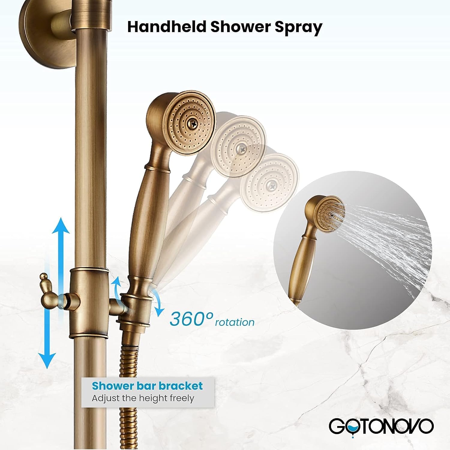 Product description Vintage bathroom shower faucet is for wall mounted installation and has antique brass finish to resist corrosion and tarnishing.The whole faucet has an 8 inch top shower and a hand held spray;suitable pore size is adjustable between 13cm-17cm.This wall mount bathtub faucet is made of premium brass material, antique brass finish to resist corrosion and anti-rust. 2 Function with handheld shower and tub filler.Shower Faucet Sets Details: Faucet Material: Brass Finish: Antique brass Mounting: Wall-Mount/2-Handle Top Showerhead: 20cm(8inch) Hole Center(hot and cold water) Distance On The Wall: 15cm(6inch) Slid Bar Height: Adjustable 80cm-120cm(31.4inch-47inch) Spray Hose: 150cm(59inch) Connection: NPT1/2 Clawfoot Bathtub Faucet Details: Material:Brass Color:Antique Brass Installation:Wall Mount, 2 holes Spray hose:145cm(57") Weight: 2.45kg(5.39 pounds) Shower head diameter: 8cm(3.1") Spout reach:11 cm(4.3’’)