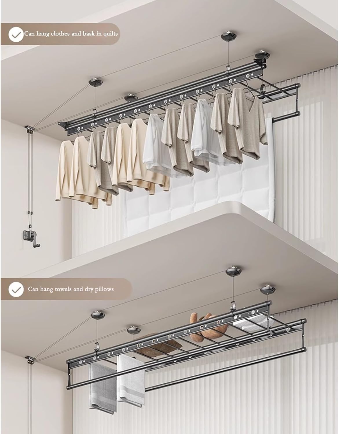 • Easy to Install: Our Ceiling Mounted Clothes Drying Rack includes all necessary hardware and installation instructions, ensuring a hassle-free setup. Designed for durability and efficiency, this Clothes Drying Rack maximizes your space while providing an effective solution for air drying your garments. Perfect for any laundry room or bathroom.