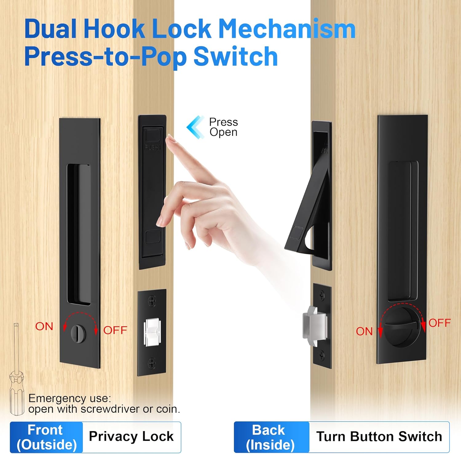 Dontay Pocket Door Privacy Lock with Edge Pull,Invisible Recessed Handle Latch Sliding Doors Lock, for 1 3/8'' to 2 3/16'' Thickness Barn Door Hardware(Privacy Lock,Matte Black,1 Set)