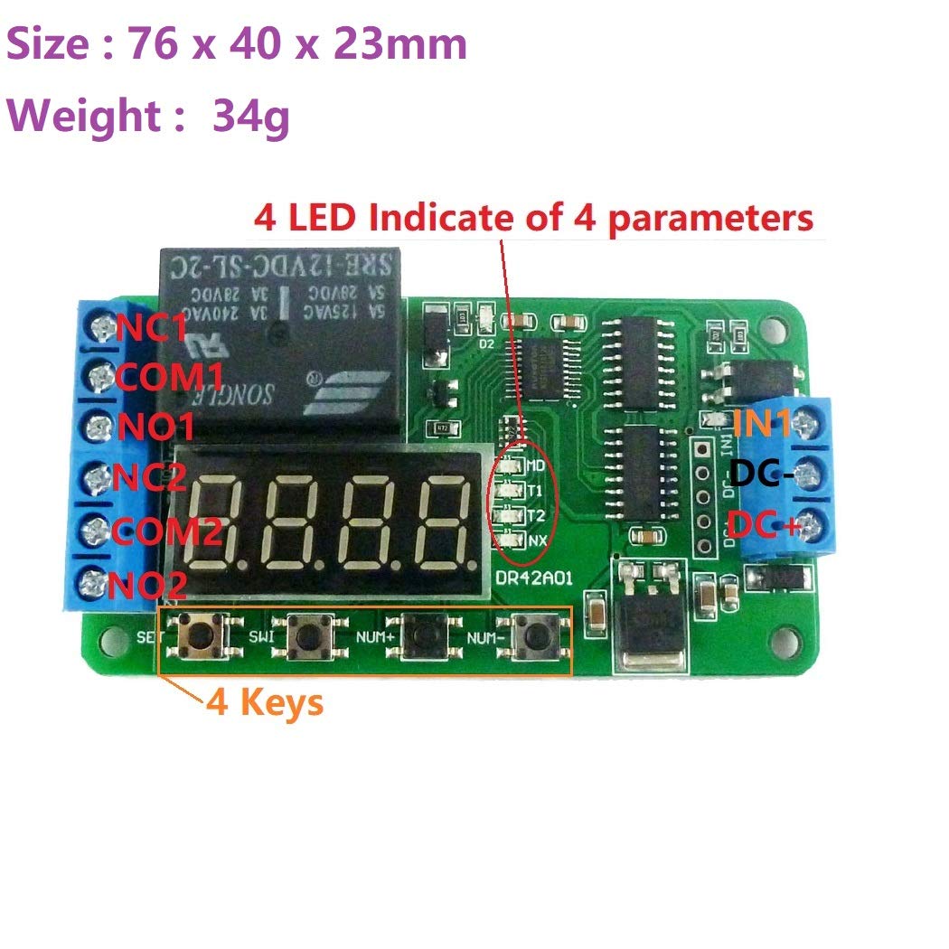 Product Name: Dual CH DC 12V Multifunction DPDT Delay Relay Time Switch Turn on/off PLC Module For Polarity switching Stereo AudioDescription:Please contact us for detailed instructions.multifunction relay control module, designed specifically for a variety of users with different needs, the use of micro-controller as the primary.Genuine high quality power relay modules, high power high-voltage transistor, red, blue signal lights, military grade double-sidedPCB board, cloth board to consider a comprehensive, stable performance, can be widely used in a variety of power control type applications.Features:1 the module functions by eight kinds before, increased to 18 kinds, to meet the needs of more applications;2 increase supply anti-reverse feature, power will not damage the module wrong;3 uses top-quality high-voltage power supply modules, discrete power supply before replacing the system more stable and reliable;4 increased 0.1 seconds timing, timing accuracy from the previous 0.1 seconds, upgrade to 0.01 seconds;5 increase in automatic power saving feature, users can independently set.Connections:Module control side: there are 3-wire interface, all interfaces are terminal1, DC +:power positive2, DC-: power in negative3, IN1: Input Detection InterfaceRelay outputs: a 3-wire interface, all interfaces are terminal1, NO: normal open (before relay closes, this pin is not connected. after relay closes, the pin short-connects with COM)2, COM: Relay Common Interface3, NC: Normal closed (before relay closes, this pin short-connect with COM. after relay closes, the pin is not connected )Module Size:1. Dimensions : 76mm *40mm * 23mm2. Screw Size: 3.0mm.3. Screw holes center distance: 69mm * 33