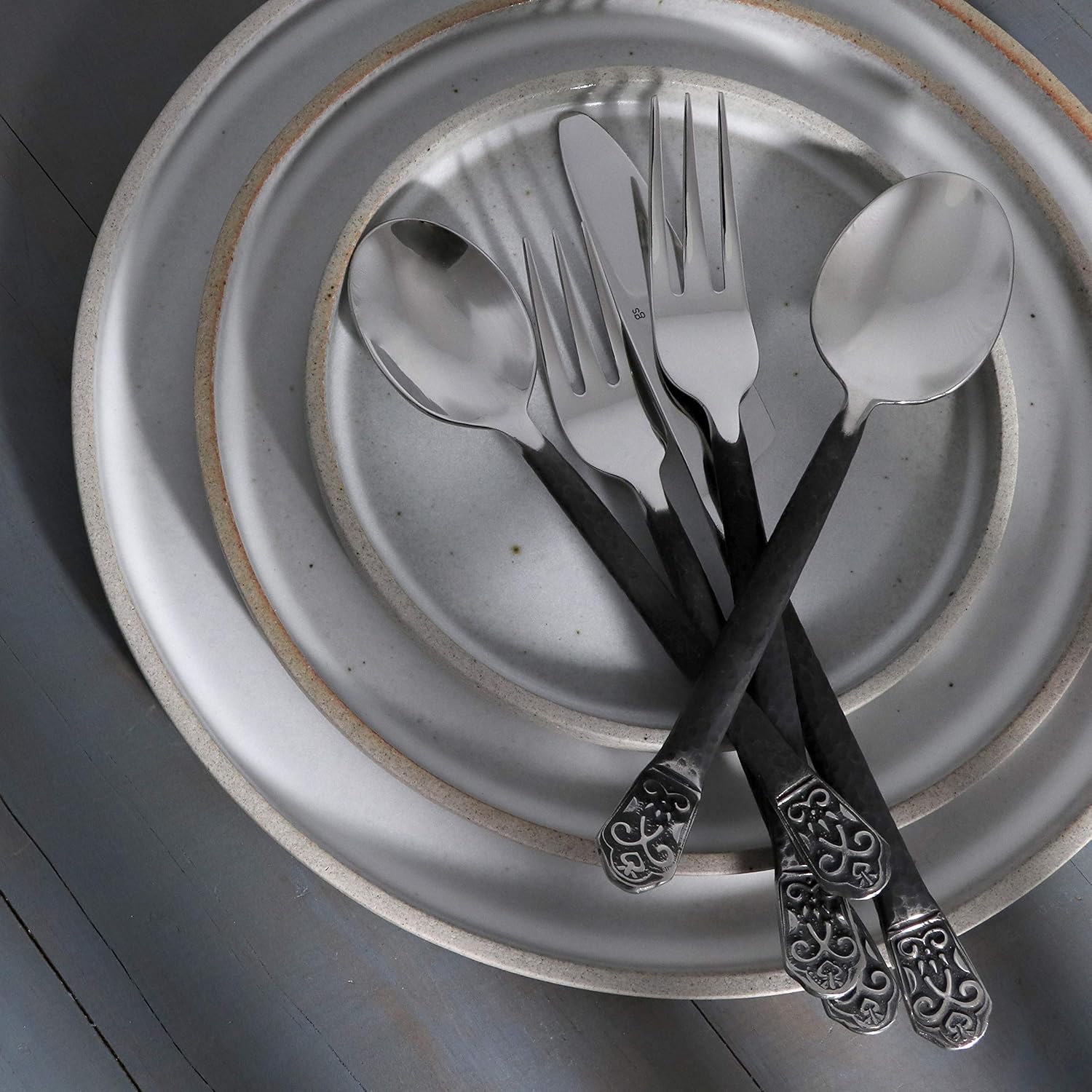 Product Description GOURMET SETTINGS At Gourmet Settings we are obsessed with design. We are constantly refining our flatware sets to ensure ergonomic integrity, timeless design, and a beautiful finish suitable for any occasion. All Gourmet Settings patterns have been meticulously designed, engineered and tested to be perfectly weighted and balanced, ensuring optimal performance and comfort you have to feel to believe. Our silverware sets are made with premium stainless steel and are guaranteed to last for years to come. Every time you pick up your fork we want to bring a little smile to your faceQUALITY: Unique stainless steel flatware sets focused on best design and size variety for comfort and performance. FINISH: This matte finish dinnerware set maintains its stunning finish perfectly with dishwasher safe materials and has been built for both sturdiness and elegance.SUITABILITY: Suited to everyday dining or casual occasions alongside any existing sets and tableware.WHAT'S INCLUDED?Salad fork x 4Dinner fork x 4Dinner knife x 4Tablespoon x 4Teaspoon x 4 A lovely pattern with pastoral flavor, Avalon flatware from Gourmet Settings has an unusual design with classic functionality. Taking its inspiration from the legend of Avalon, a mystical island associated with Arthurian legend, the pattern features sculpted handles with a textured surface. The design transitions to an intricate flourish pattern at the tip. While Avalon handles have a black finish that looks antiqued, the working ends are brightly polished for handsome contrast. Elongated oval bowls and narrow triple tines complete the design. With 20 pieces in all, this Avalon set includes four place settings, each with a salad fork, a dinner fork, a knife, a soupspoon, and a teaspoon. Crafted from heat-forged 18/10 stainless steel, the design is pleasant in the hand and resistant to corrosion. As with other Gourmet Settings patterns, Avalon is safe in the dishwasher for convenience and carries a 50-year warranty. --Emily Bedard What's in the Box 4 place settings. Each place setting consists of: dinner fork; salad fork; soupspoon; knife; teaspoon. 20 pieces total. Amazon.com A lovely pattern with pastoral flavor, Avalon flatware from Gourmet Settings has an unusual design with classic functionality. Taking its inspiration from the legend of Avalon, a mystical island associated with Arthurian legend, the pattern features sculpted handles with a textured surface. The design transitions to an intricate flourish pattern at the tip. While Avalon handles have a black finish that looks antiqued, the working ends are brightly polished for handsome contrast. Elongated oval bowls and narrow triple tines complete the design. With 20 pieces in all, this Avalon set includes four place settings, each with a salad fork, a dinner fork, a knife, a soupspoon, and a teaspoon. Crafted from heat-forged 18/10 stainless steel, the design is pleasant in the hand and resistant to corrosion. As with other Gourmet Settings patterns, Avalon is safe in the dishwasher for convenience and carries a 50-year warranty. --Emily BedardWhat's in the Box 4 place settings. Each place setting consists of: dinner fork; salad fork; soupspoon; knife; teaspoon. 20 pieces total.