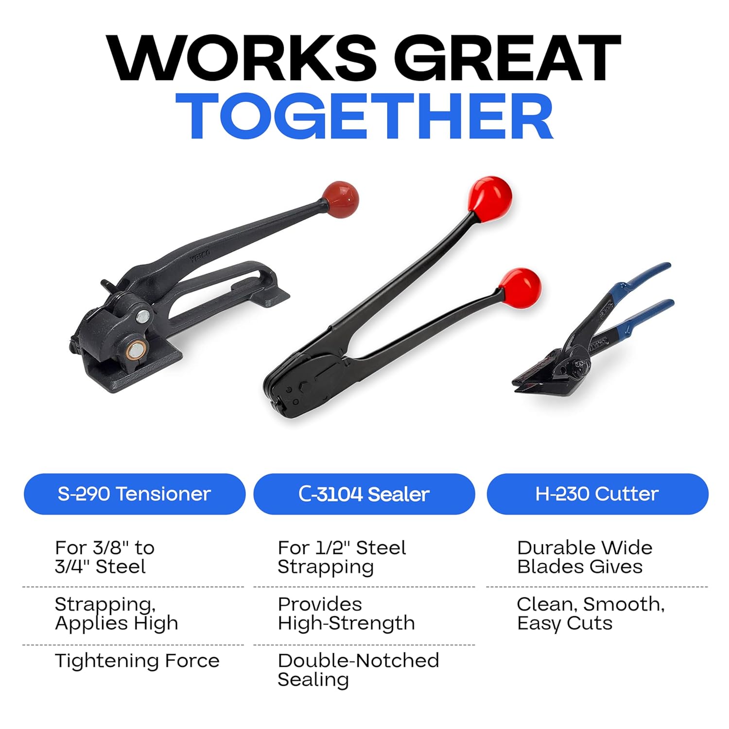 The manual Teknika C-3104 Double-Notched Front-Action Sealer is a professional tool with high strength sealing action. It supports a steel strap of 1/2-inch wide and up to 0.028-inch thick. The metal banding sealer is used to secure the ends of the steel (or metal) strapping with seals when the packaging of heavy loads is needed, such as lumber, pallets, metal billets, ingots, building materials, etc. The banding process consists of three stages: feeding the strap around the package, tightening the strap, and sealing its ends. This tool is easy to operate and does not require any specialized knowledge or skills. Excellent for indoor or outdoor use. The strapping tools are used in different industries, such as aerospace, transportation, agriculture, construction, pharmaceuticals, hospitality, manufacturing, etc. You can find a wide variety of strapping products at our IDL Packaging Amazon Brand Store, along with pre-selected complete strapping kits with different types of strapping.