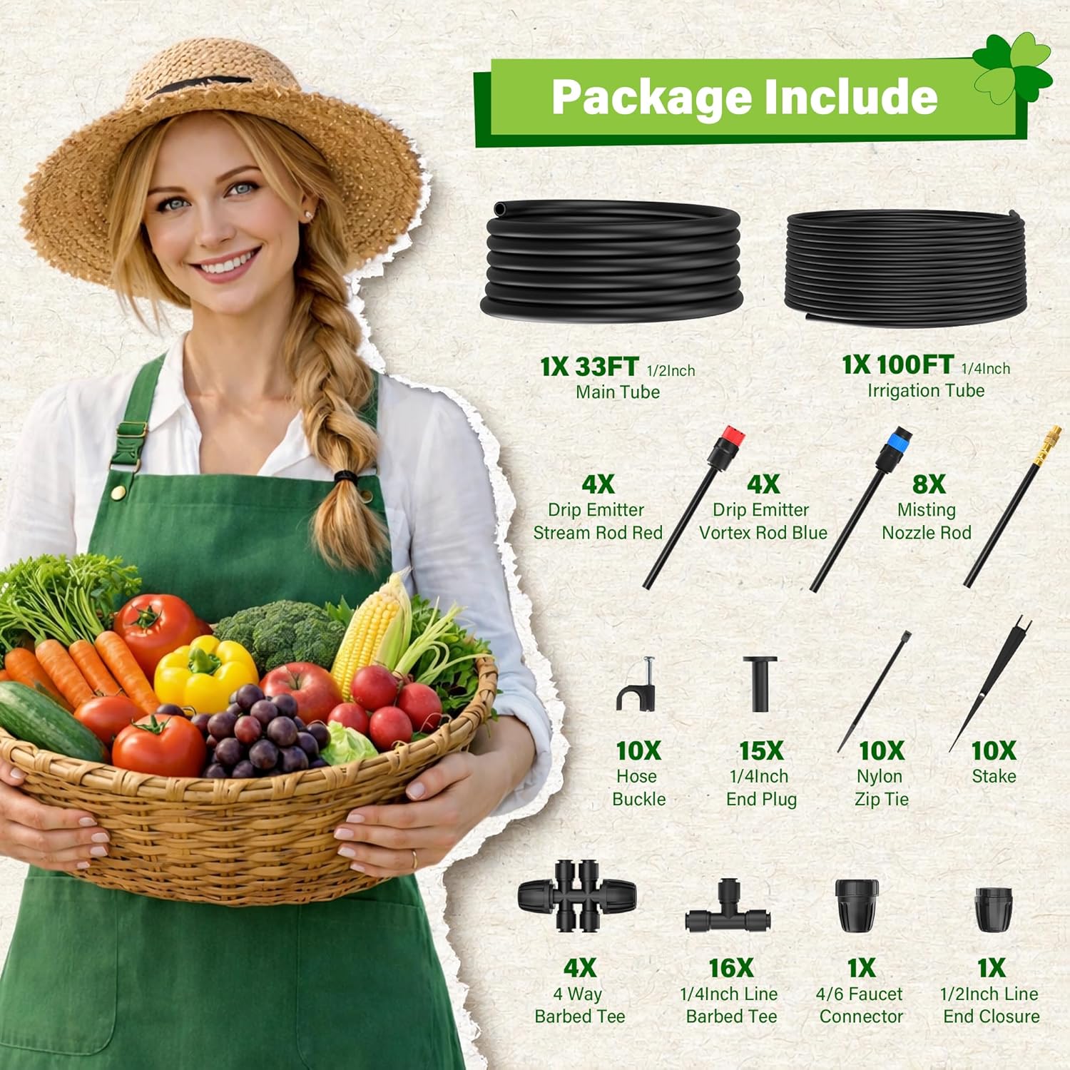 Package Include:1X 1/2" 33FT Main Tube1X 1/4" 100FT Irrigation Tube4X Drip Emitter Stream Rod Red4X Drip Emitter Vortex Rod Blue8X Misting Nozzle Rod 4X 4 Way Barbed Tee1X 4/6 Faucet Connector16X 1/4Inch Line Barbed Tee1X 1/2Inch Line End Closure15X 1/4Inch End Plug10X Stake10X Nylon Zip Tie10X Hose Buckle