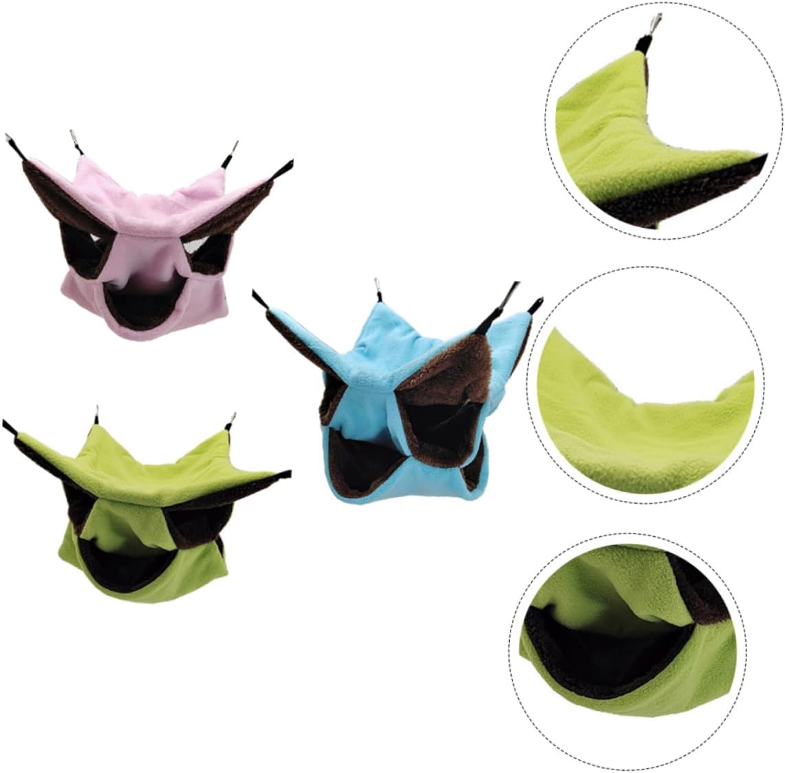 Package List 6 x hammock Characteristics - Material: plush Small Hamster Hammock - Color: blue+green+pink Hammock - Size: About 30 x 30 x 1 cm/11.79 x 11.79 x 0.39inch Hamster Hammock - Fashionable and design is nowadays Plush Pet Bed. - Light in weight, so it is easy to up Warming Pet Nest. - then can be hanged wherever you like, very convenient Suspensible Pet Bed. - Our product is made of plush, really and comfortable and use Suspensible Pet Supplies. - It is wonderful for hamster, making sure your pets have a good place to play and sleep Small Pet Bed.Goods DescriptionSmall Hamster Hammock Fashionable and design is nowadays.Suspensible Pet Bed I believe you must like it.Plush Hammock Light in weight, so it is easy to up.Warming Pet Nest Our product is made of plush, really and comfortable and use.Warming Pet Supplies And then can be hanged wherever you like, very convenient.Three-layer Bed It is wonderful for hamster, making sure your pets have a good place to play and sleep