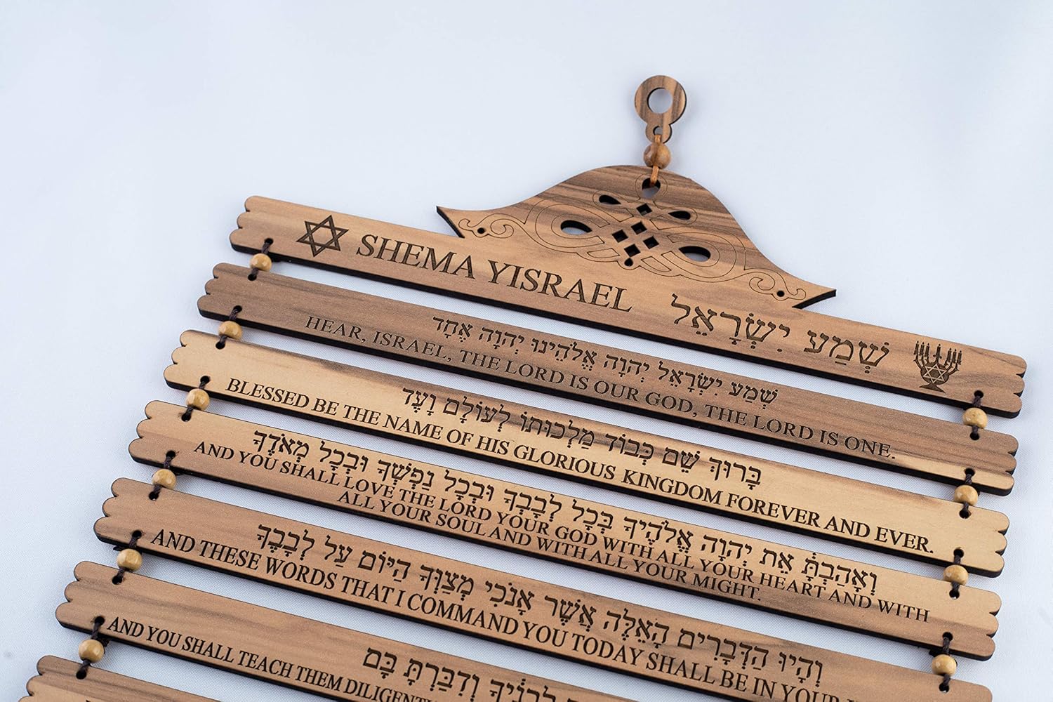 Shema Yisrael is a Jewish prayer, and is also the first two words of a section of the Torah, and is the title of a prayer that serves as a centerpiece of the morning and evening Jewish prayer services. The Shema Yisrael scripture (English/Hebrew)engraved onto wooden blocks and woven together to form a wonderful plaque. The Engraved blocks are threaded together with strong cord andolive wood beads insertedto separate the pieces. Ideal Judaism gift from the lands of the bible where Jesus Was Born, Crucified and Rose on the 3rd Day