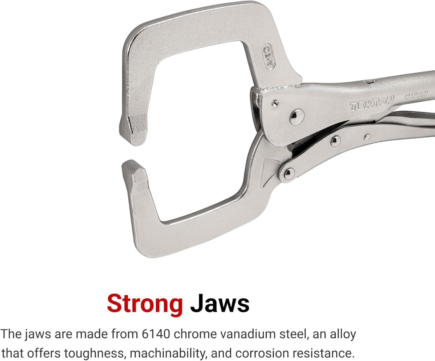 Tekton locking C-clamps apply direct pressure with fixed points to clamped surfaces, secure small parts, and allow access to tight spaces where a swivel pad won't fit. Easily set, release, and reposition the clamp with one hand and with more control than a traditional pinch-style lever. The adjustment knob is knurled and round to provide grip for making adjustments even when you're wearing gloves or have slippery hands. Get extra leverage and fine-tune your clamping force by inserting a screwdriver or hex key into the through-hole to create a T-handle. Clamping force at the jaws directly depends on the strength and integrity of the clamp’s three main rivets, which together make up the 4-point mechanical structure of the clamp. To make sure ours can withstand high shear forces, these rivets are made from tough 4135 chromium molybdenum steel. The clamps have a durable, nickel-plated finish that protects against corrosion.