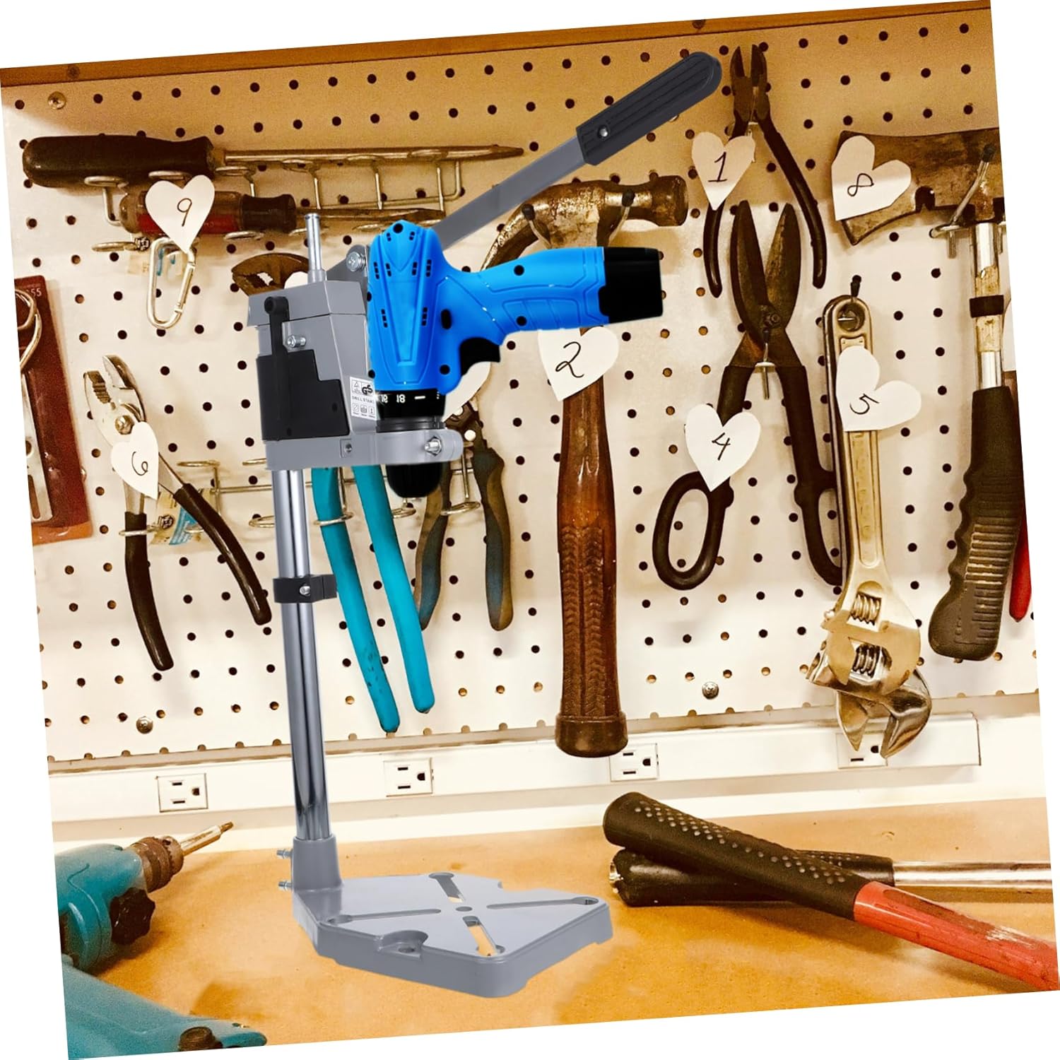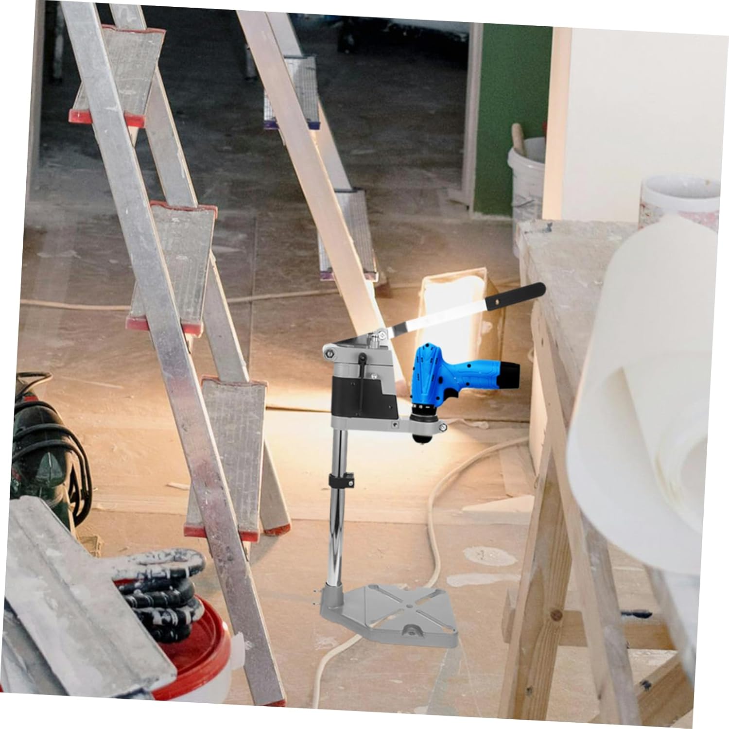Package List 1 x drill press stand Features - Size: About 50.00X14.50X14.50cm/19.65X5.70X5.70in drill press stand - Material: Iron - Color: Silver - The drill press has a sturdy heavy-duty cast iron base to ensure maximum stability and has mounting holes so it can be fixed to a workbench portable drill press stand. - Designed for use with any power drill with collar diameter ranging from 38mm to 43mm hand drill press. - Holding your drill steady during use - allowing for much more accurate drilling than hand-held operation hand drill press stand. - Durable metal spindle and steel base, make your operation more stable and efficient drill press for hand drill. - Makes your exercises stable during use and allows much more accurate than hand operation.Goods Descriptiondrill press for hand drill Designed for use with any power drill with collar diameter ranging from 38mm to 43mm.hand drill press This accessory is great for any DIY-er or professional.portable drill press stand The drill press stand rack is a professional-grade tool, for holding your drill steady during use - allowing for much more accurate drilling than hand-held operation
