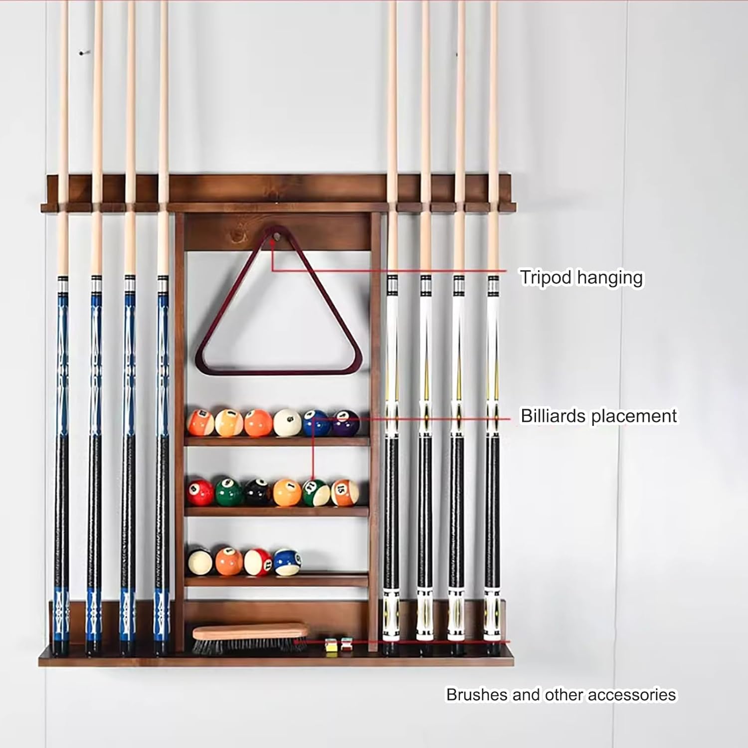 The pool cue rack is designed to keep your favorite cue sticks organized and secure, minimizing clutter while enhancing the professional look of your game room. Perfect for various settings such as family game rooms, billiard halls, bars, or man caves, this rack not only adds functionality but also elevates the overall aesthetic of your space. **Product Highlights:** - **Material:** Crafted from solid wood, ensuring durability and stability for your cue sticks. - **Size:** Measuring 91.5x11x73.3cm (36.02x4.33x30.43in), this rack offers ample space for up to 8 cues. - **Design:** Features a rounded corner design to prevent accidental bumps while retrieving your cues. Each hole is lined with a wear-resistant plastic ring, reducing friction and protecting your valuable cues from damage. **Versatile Use:** Ideal for billiard rooms, homes, restaurants, and bar areas, this cue rack seamlessly fits into any environment, providing both style and practicality. **Package Includes:** 1 × Pool Cue Rack (other items in the pictures are not included) Invest in this essential accessory to enhance your billiards experience, ensuring your cues are always ready for the next game. Enjoy a tidy setup that reflects your passion for the sport while protecting your equipment.