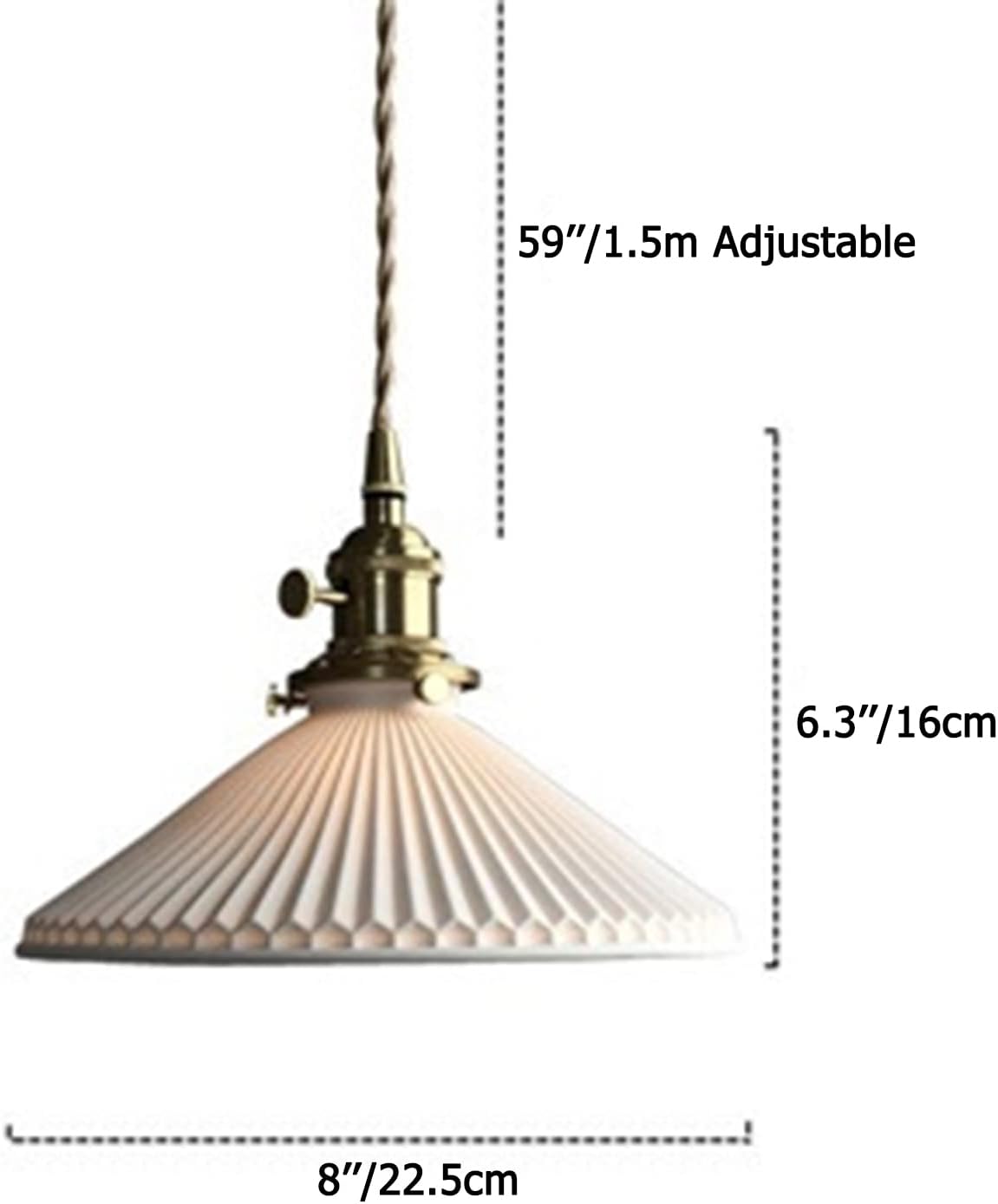 This pendant light features a beautifully crafted ceramic shade with a durable brass socket, creating a timeless and sophisticated look that enhances any room’s decor. It includes a 59-inch (1.5m) adjustable hanging cord, allowing you to customize the height for different ceiling types and spaces, such as living rooms, dining areas, or kitchen islands. Compatible with standard E27 bulbs (bulbs not included), it works well with LED, incandescent, and energy-efficient bulbs, including dimmable options. The package includes all necessary hardware for easy installation, and the stylish design makes it perfect for living rooms, bedrooms, corridors, staircases, and commercial settings like offices, cafes, and bars.