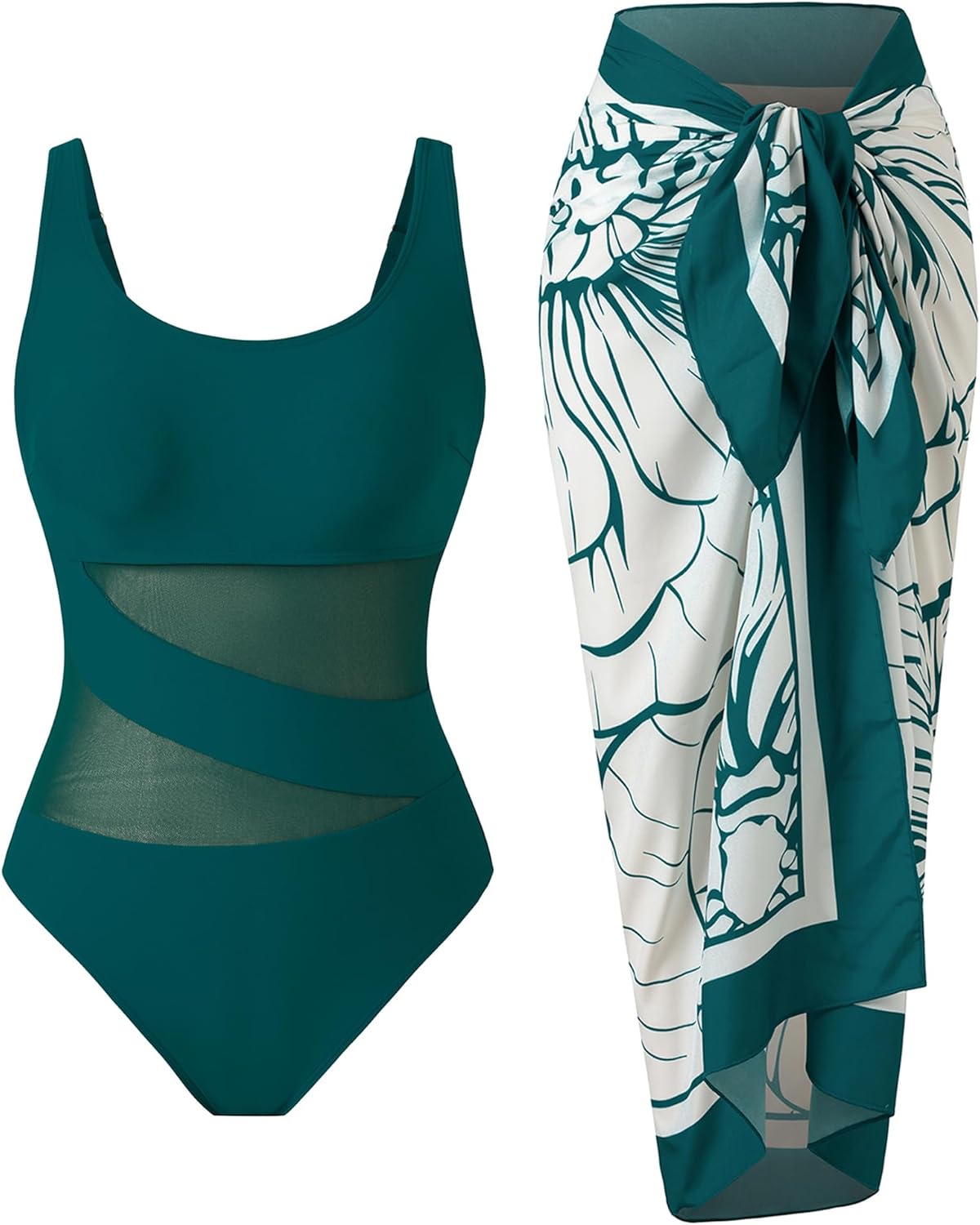 This women’s one-piece swimsuit features a flattering tummy-control design, mesh detailing, and a retro skirt style. Paired with a matching wrap cover-up, it offers comfort, elegance, and full confidence for beach or pool days.