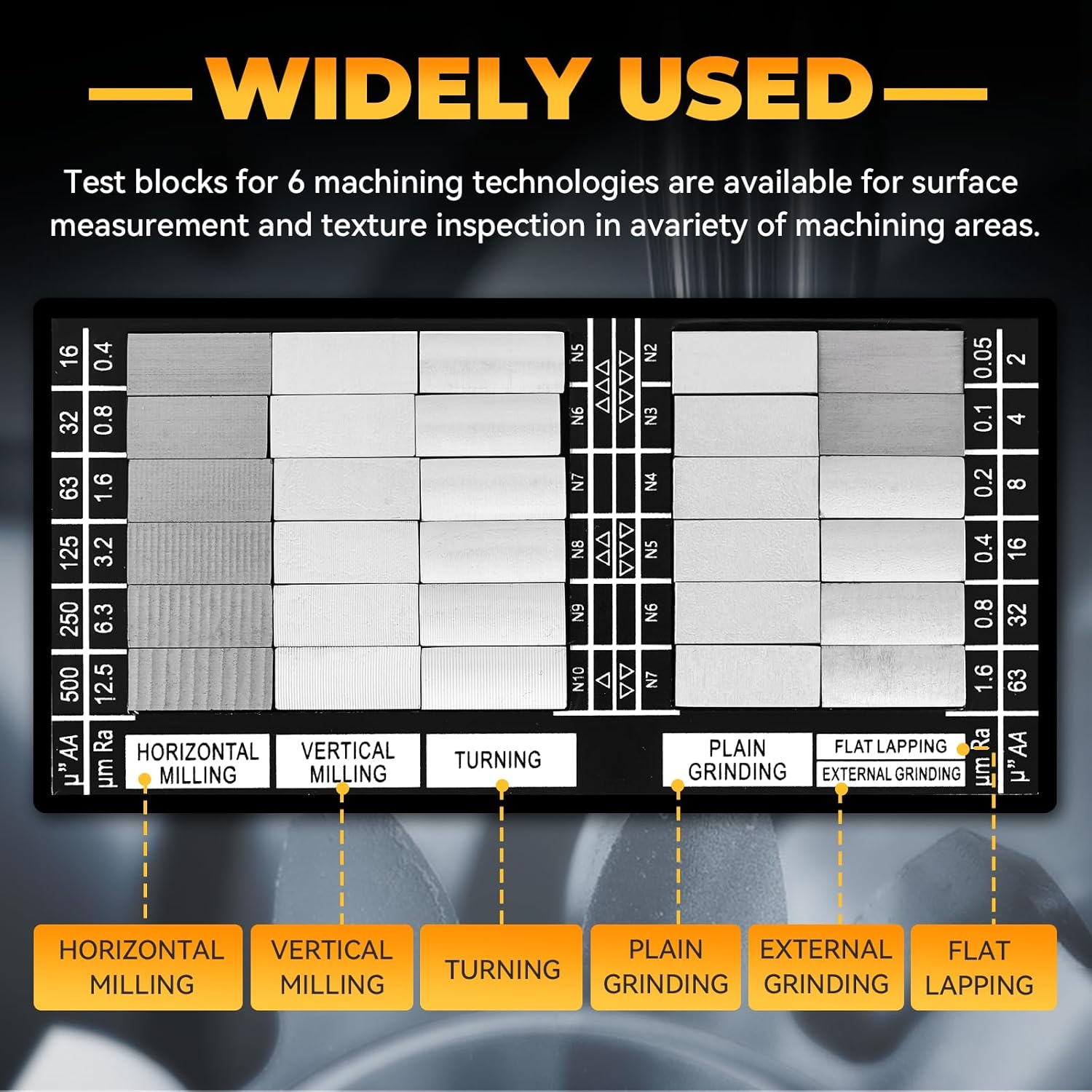 Introduction Surface roughness comparator is used to check the smooth finish of a mechanical workpiece by comparision method and eye estimation or microscope is used to compare and detect the degree of the surface roughness. RUG-100:Note book sample block(turning,vertical milling,plain milling, plain grinding, extermal grinding, polishing.) Notebook sample block contains standards for the six most important maching methods in the prevalent “AA” values. All 30 speciments are calibrated in uAA(Arithmetical Average) and in the metric equivalents um Ra.